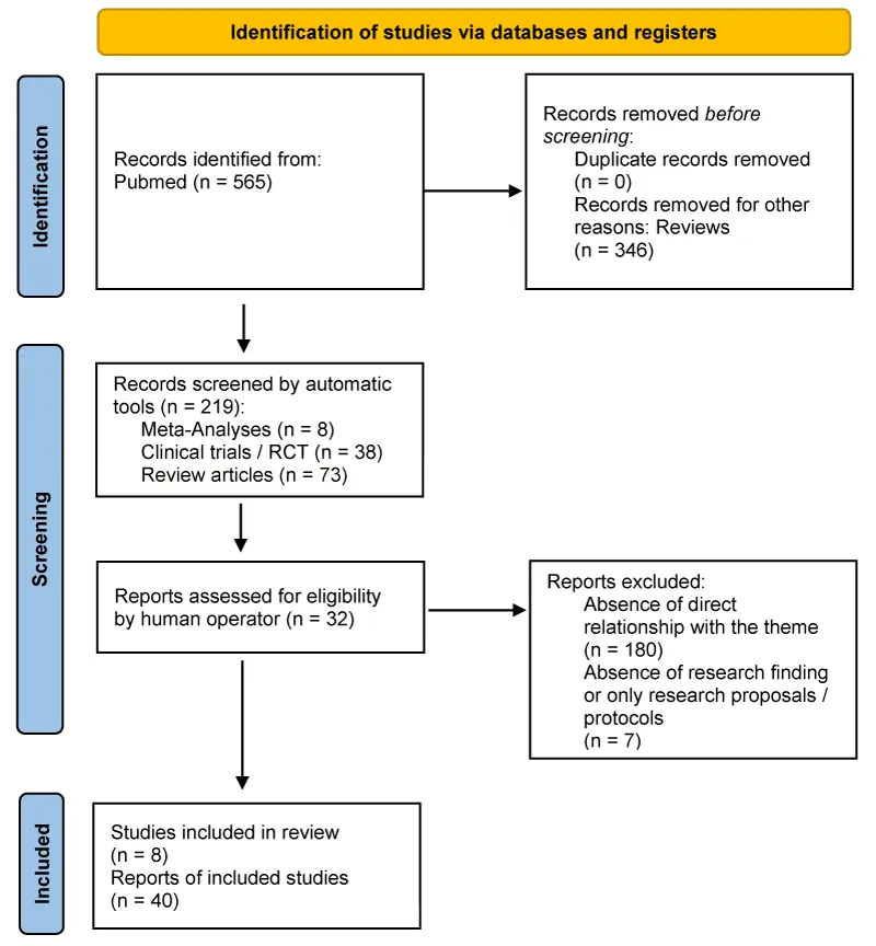 We searched on Pubmed until January 30, 2023, clinical trials and randomized controlled trials using in combination the keywords “gut microbiota”, “preterm infants”, “prebiotic” and “probiotic”, selecting 219 useful results. To these were also added 8 reviews related to the last two years, in order to have a greater and complete overview of the topic, ultimately selecting a total of 40 research and studies, for a total population of over 37,000 infants, of which slightly less than half are represented by term infants in the control groups. Simple reviews, opinion contributions, or publications in popular volumes were excluded because they were not relevant or redundant for the purposes of this work, and 7 types of research of the final total because they did not present results or statistical samples but only protocol and research proposals [1-3], did not specifically address the relationship between the gut microbiota and preterm infants [4], the data were contradictory, unreliable, or otherwise, the research design had functional shortcomings [5], or the study sample was not directly preterm infants [6,7].