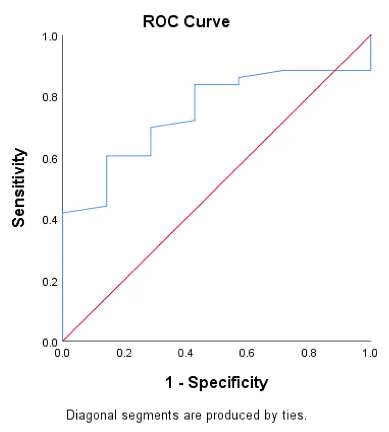 An ROC curve (receiver operating characteristic curve) was obtained after analysis. The sensitivity of the test was found to be 72%, specificity of 57.1%, the area under the curve was 0.746 and was statistically significant with p value of 0.039. (Figure 1, Table 4)